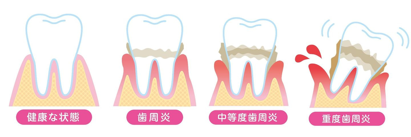 歯周病とは、歯と歯ぐきのすき間(歯周ポケット)から細菌が侵入し、歯肉に炎症を引き起こしたり、歯を支える骨(歯槽骨)などが溶けたりする病気です。歯を失う原因として、虫歯よりも多くの割合を占めています。炎症が歯肉だけに留まっている状態を「歯肉炎」、炎症が歯槽骨や歯根膜にまで広がっている状態を「歯周炎(歯槽膿漏)」といいます。虫歯と異なり痛みがなく、気づかないうちに進行する特徴があり、歯周ポケットが深くなっていくと、歯肉が腫れたり、歯がグラグラしたりして、ものが噛めなくなり、歯が自然に抜け落ちるほど重症になることもあります。