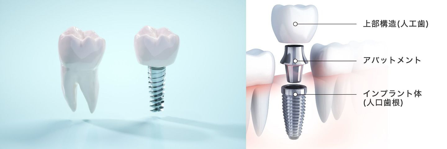 インプラントは基本的に3つのパーツからできています。土台となるのが歯槽骨に埋め込むインプラント体と呼ばれる人工歯根です。材質はチタンあるいはチタン合金で、様々な長さや太さがあり、骨量や埋める位置によって選択します。その上に上部構造と呼ばれる人工の歯をかぶせます。材質は主にジルコニアという材質のものを使用します。強度や色調に違いがあります。人工歯根と上部構造の間にはアバットメントという部分があり、2つを連結するとともに人工歯根を守る役割を担います。材質はチタンです。