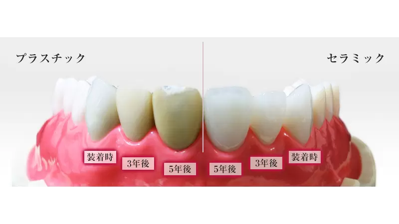 セラミックは、表面が滑らかで非常に着色しづらい素材なので、5年後も装着時とほとんど変わらない白さと美しさを持続出来ます。